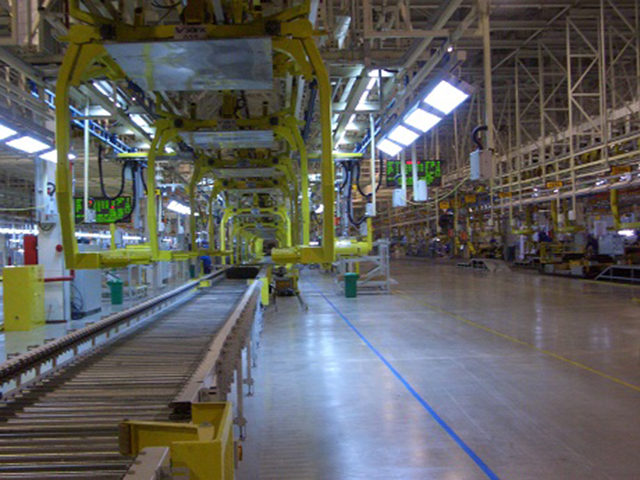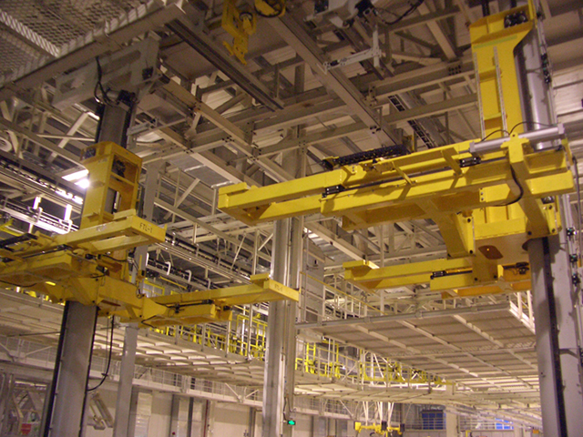 此項目總包方為日本大福,全線采用摩擦驅(qū)動?罩袃Υ婢和地面生產(chǎn)線采用斜坡鏈條銜接,車輛上下線為平臺升降機(jī)。生產(chǎn)工位高度變化要求通過走行軌的起伏變化實現(xiàn)。整個總裝的工藝布局與上汽臨港工廠基本類似。